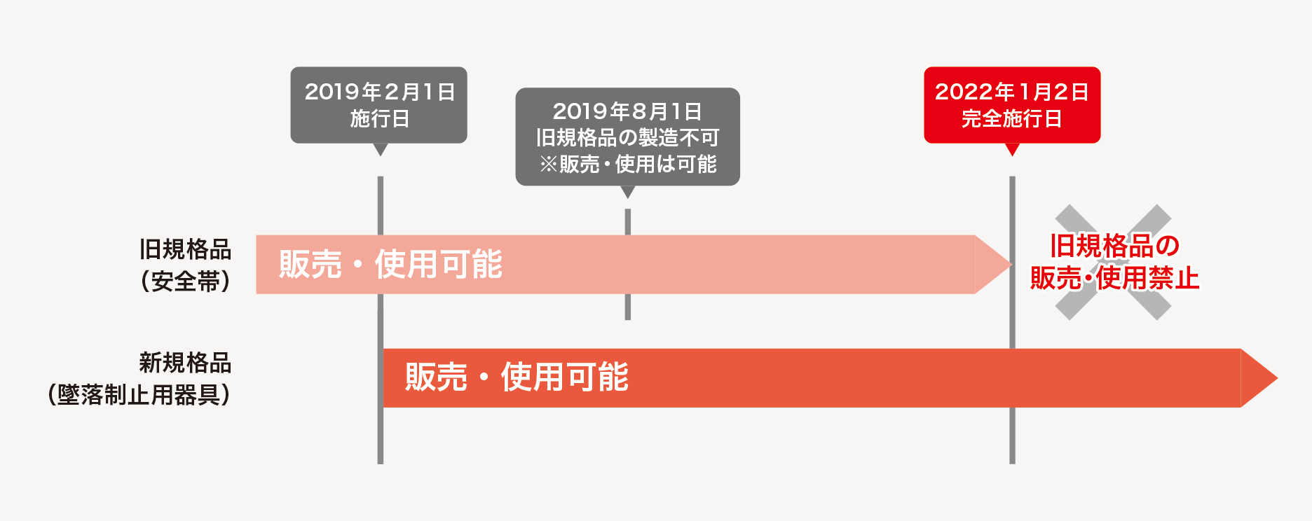 規格改正に伴い、2019年8月1日までに製造された旧規格の安全帯は、墜落制止用器具の規格とみなされ、2022年1月1日まで使用可能となります。