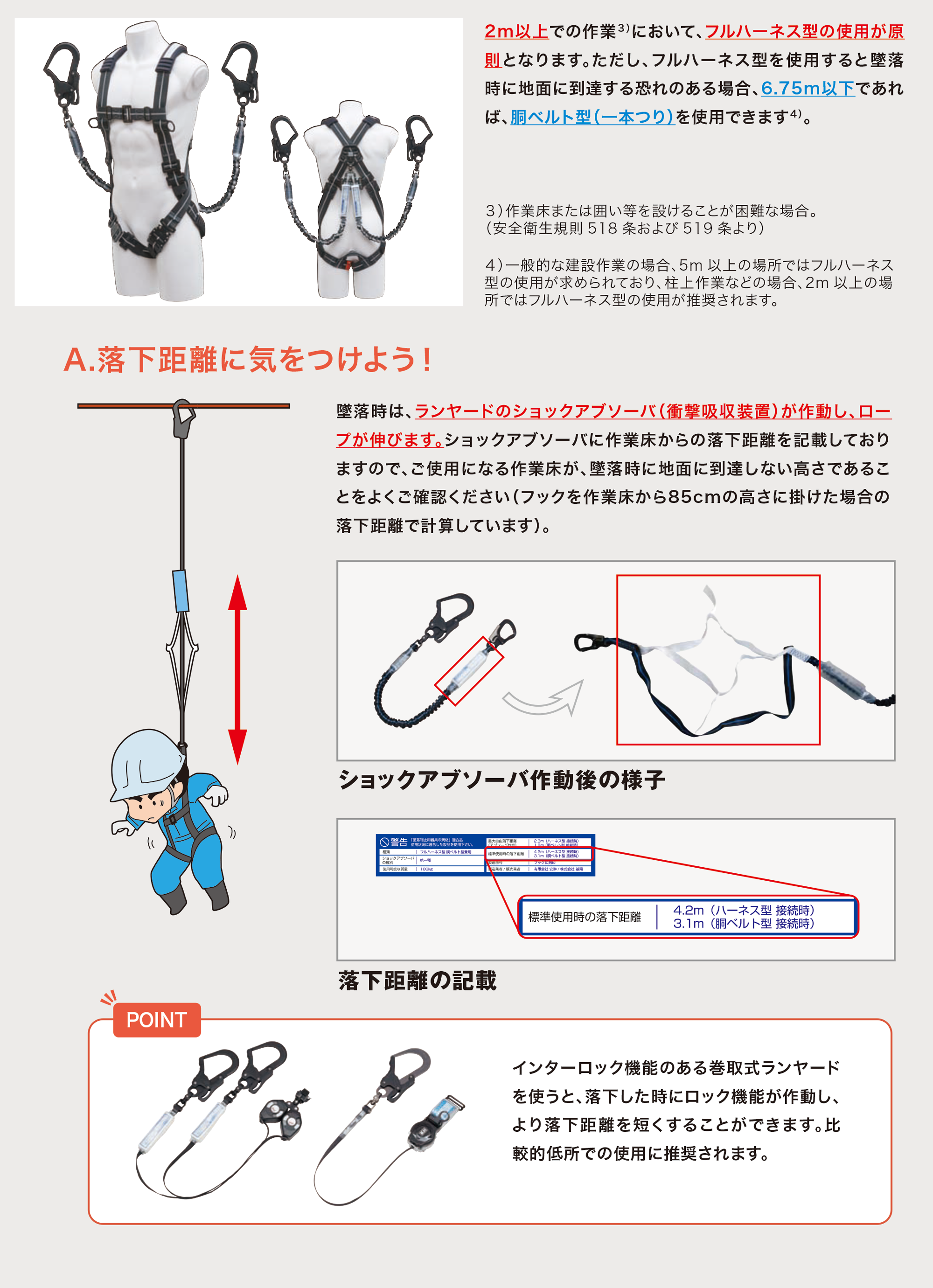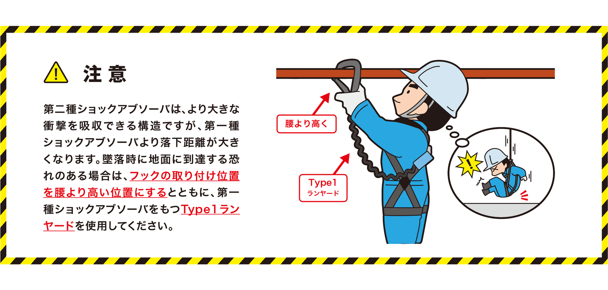 しますが、鉄骨組み立て作業等において、やむを得ずフックを足下に掛ける場合は「第二種ショックアブソーバ」をもつ「Type2ランヤード」を使用します。両方の作業が混在する場合は、フルハーネス型を選定するとともに、「第二種